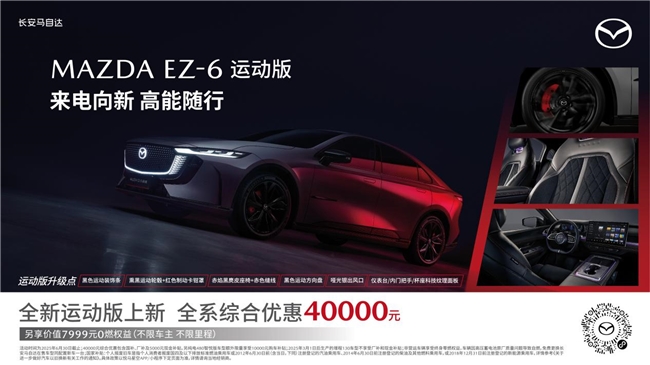 作为合资新能源B级轿车的全新价值标杆,MAZDA EZ-6从产品设计、研发到生产均严格遵循马自达全球统一标准,以全球标准打造全球品质。即将上市的EZ-6运动版在外观方面新增多处黑化套件:曜黑色下包围搭配亮黑色锻造轮毂、红色卡钳罩,赛道感爆棚。内饰方面,新增黑色麂皮座椅,并加入了更具运动感、战斗气息的黑色和红色缝线,扶手箱、空调出风口采用了黑色烫印工艺装饰。活动期间,购车用户可享受至高40,000元补贴(15,000元置换厂补+20,000元置换国补+5,000元保险补贴),补贴后增程车型9.98万起,纯电车型10.98万起,指定车型再享10,000元补贴。贷100,000元可享6年0息(和置换厂补二选一),还可享价值7,999元不限车主、不限里程终身零燃权益。
