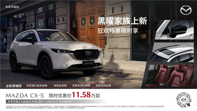黑色能够搭配所有色彩,这是时尚界的定律。作为象征奢华和力量的典型色彩,黑色具备的魔力让它在设计中历久弥新。当黑色与「魂动」美学碰撞,MAZDA CX-5致力于为年轻用户创造时尚、个性的拥车生活。MAZDA CX-5黑曜版拥有充满速度感、力量感的黑化涂装和充满驾驭激情的内饰设计。轮毂、后视镜和车顶行李架部位运用了熏黑工艺,熏黑部位采用钢琴烤漆工艺处理,呈现出极富质感的亮黑色,带来更强烈的速度感和运动感。在环保标准日益严苛的当下,MAZDA CX-5无需额外加装繁琐的“颗粒捕捉器”便能从容满足 “国六B” 排放标准。活动期间,MAZDA CX-5全系焕新价11.58万起,符合条件的用户置换购车可享至高6,000元厂补和15,000元国补。